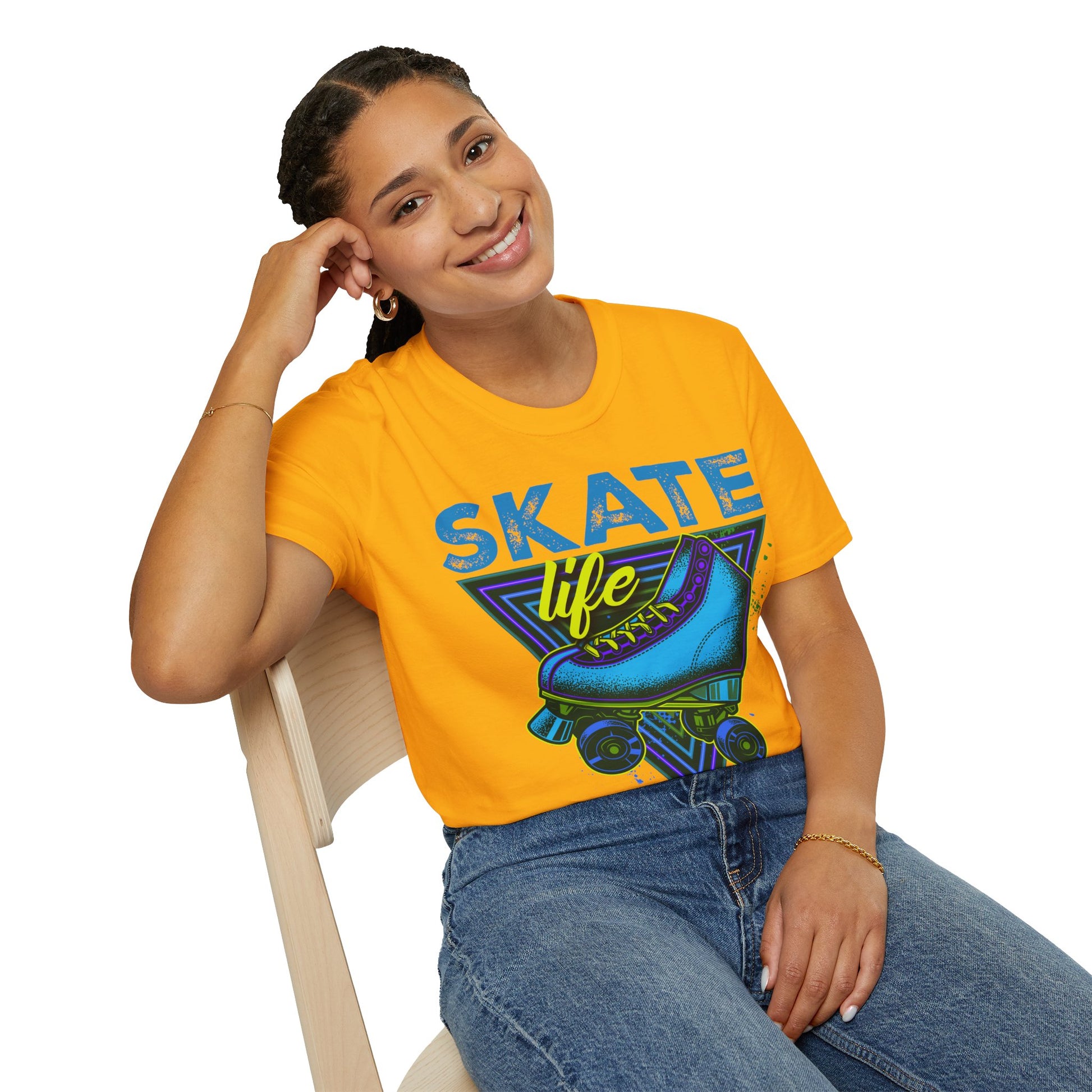 Roller skate graphic tee for skaters and retro streetwear enthusiasts. This Skate Life T-Shirt exudes a cool and edgy vibe, perfect for those who love skating and vintage fashion. Ideal for casual wear or as a statement piece for roller skating enthusiasts. Relevant for birthdays, skate parties, and casual outings.